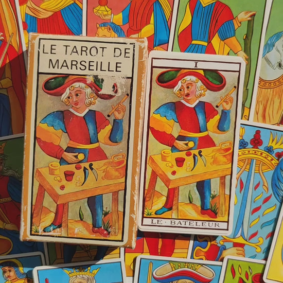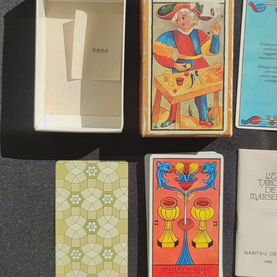 Discover a true historical gem of divination with this Marseille Tarot by Maritxu de Guler, published in 1983 by the renowned Spanish manufacturer Fournier. This rare tarot deck is the first Marseille Tarot edition released by Fournier, resulting from the collaboration between tarot expert Maritxu de Guler and illustrator A. Aymerich. Inspired by the original deck of Nicolas Conver (1761) and visually close to the Paul Marteau style (1930), this version offers more colorful illustrations—perfect for modern tarot readers and collectors.